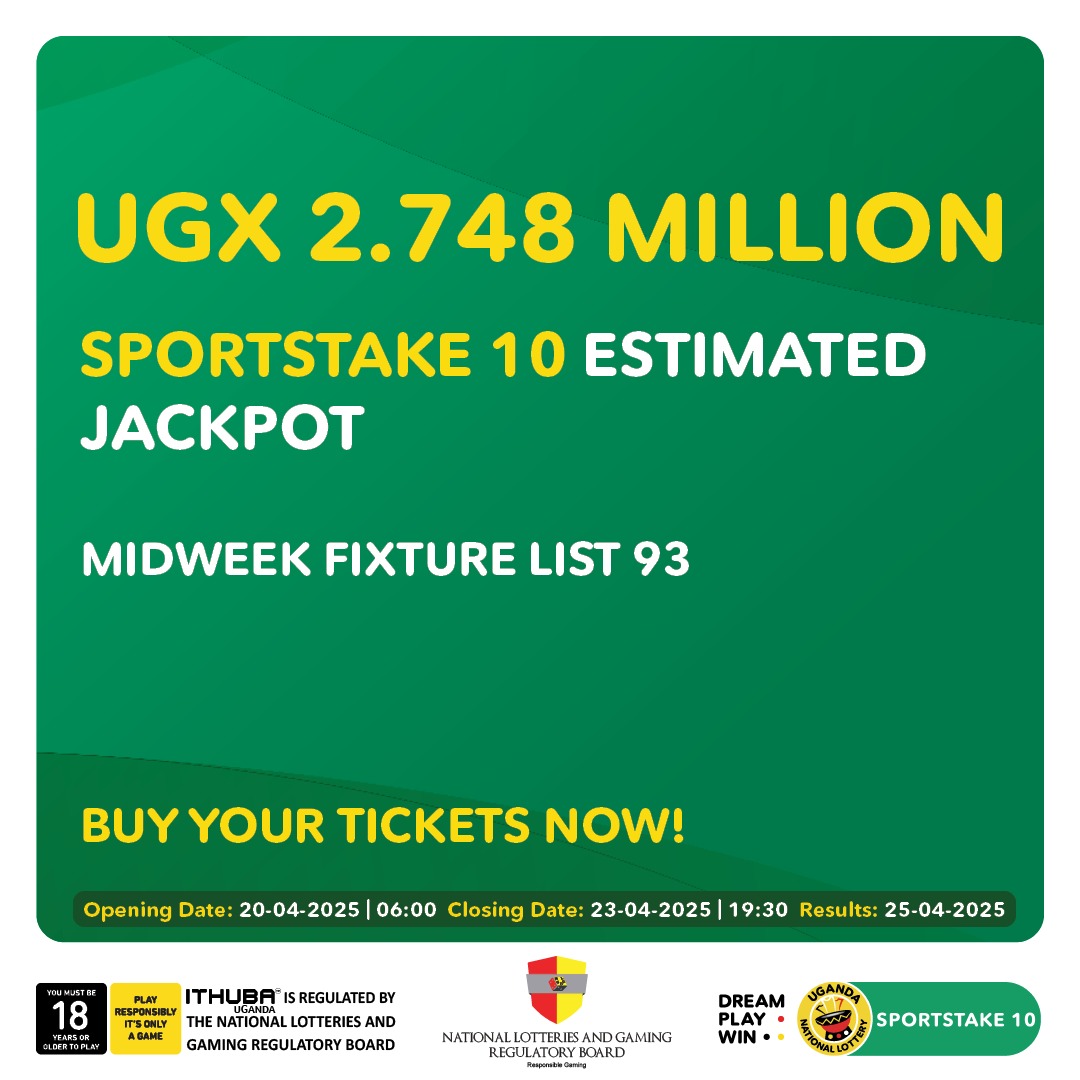 Next #SPORTSTAKE10 Midweek fixture list 93 jackpot is ESTIMATED at UGX 2.748 Million! PLAY NOW at any authorised shop near you, or on https://bit.ly/4eMCQba#MillionzZizino#SPORTSTAKE10#UgandaNationalLottery