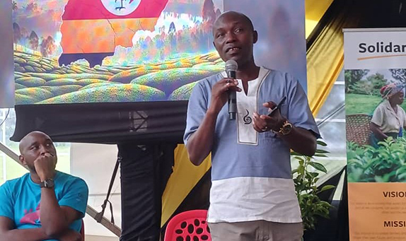 Onesmus Masiko, Chairperson of the Uganda Tea Outgrowers Association (UTOA) presenting at the conference. (Courtesy)
