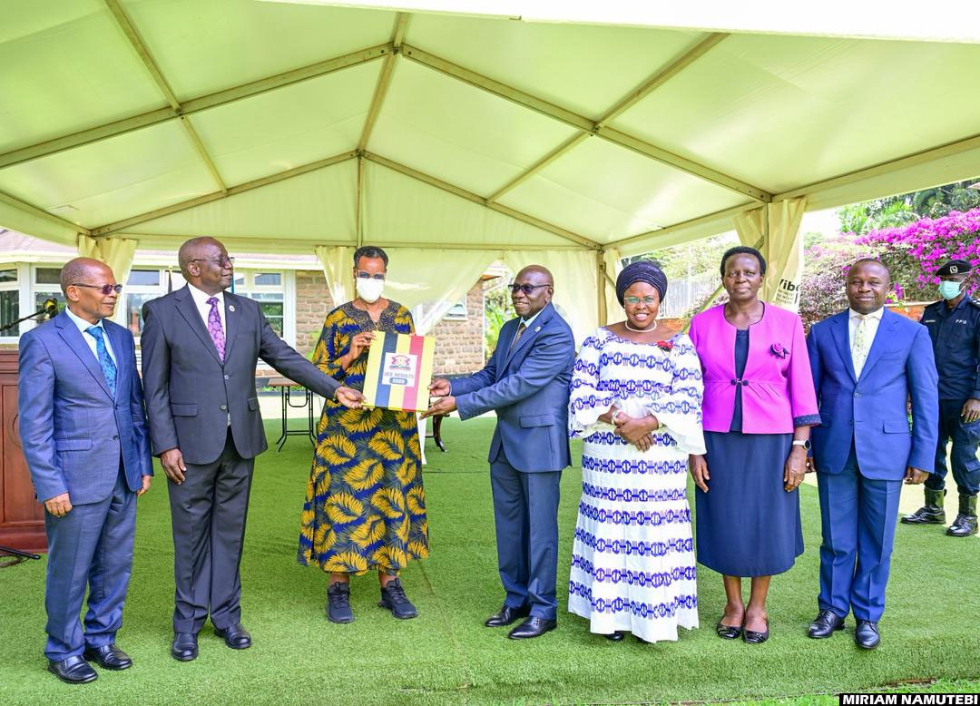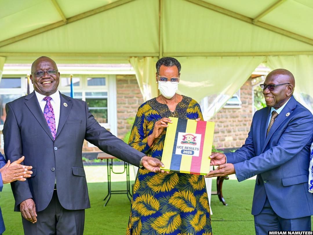 The UNEB hierarchy hands over the results of the 2025 UCE examinations to the First Lady and Minister of Education & Sports, Janet Museveni in the presence of the four education state ministers.
