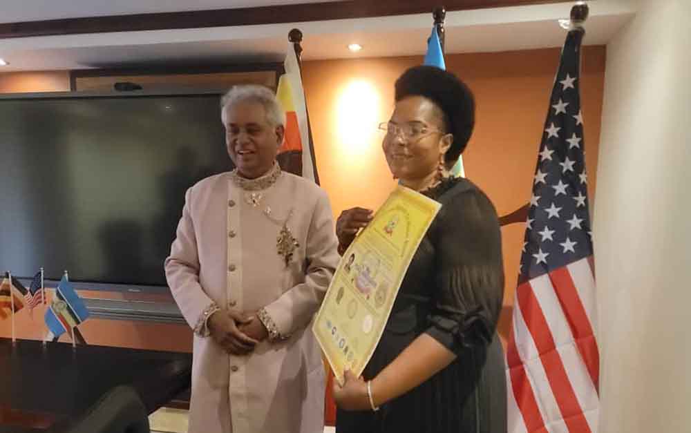 His Eminence Dr. Madhu Krishan, the Eminent Scientist, Global Leader of Global Peace, presented the 2025 Award to Namuganza today at Serena Hotel in Kampala.