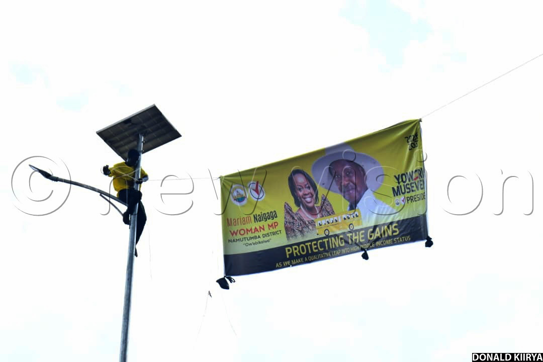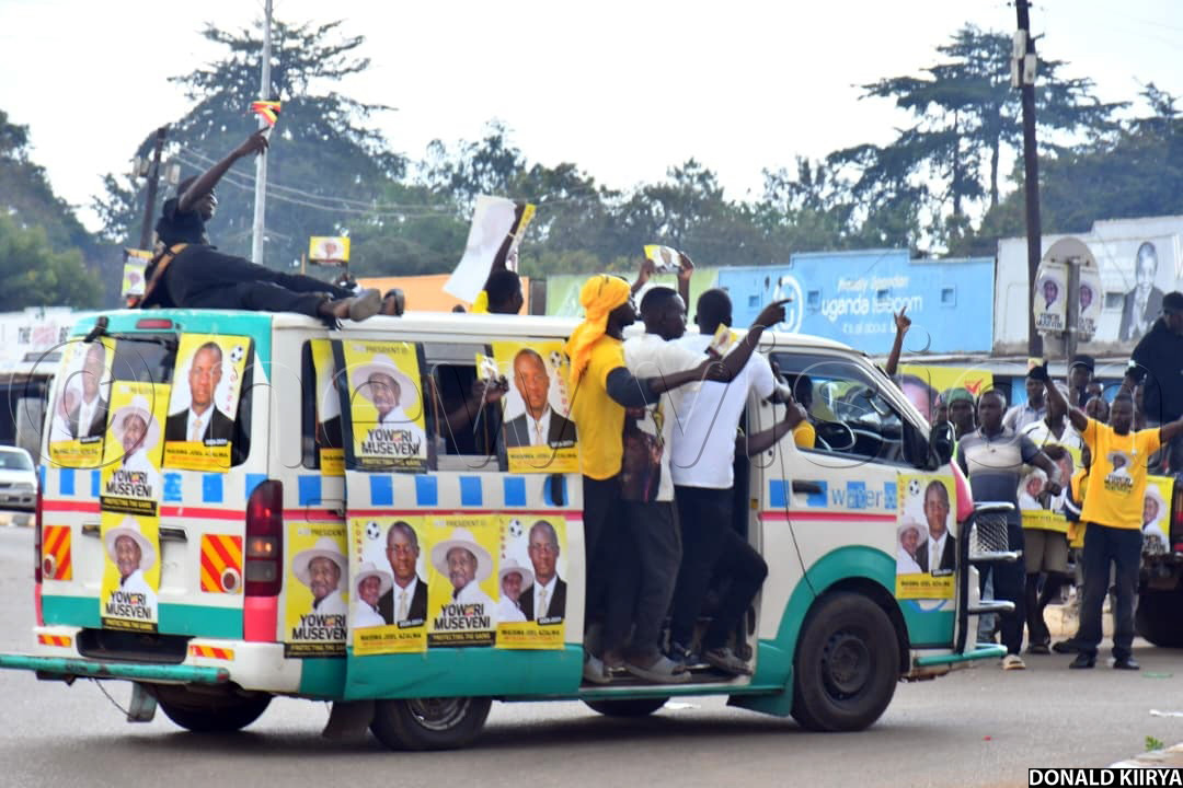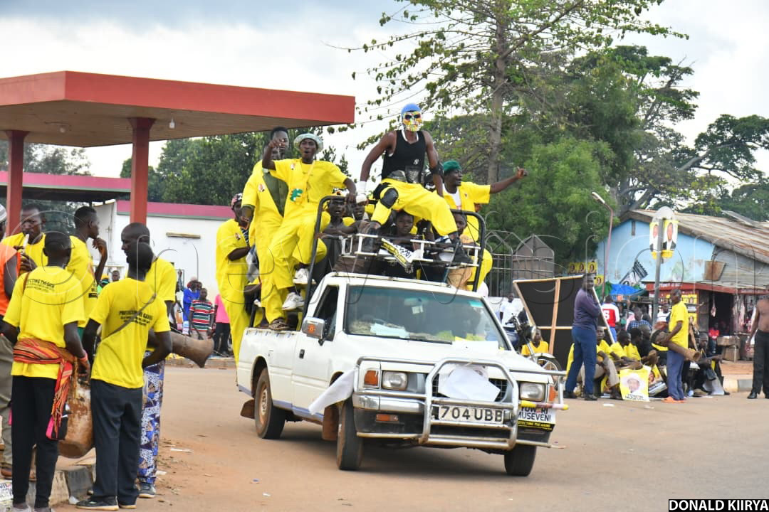 In Namutumba town council, where Museveni held his second and final rally of the day, NRM supporters walked along several streets carrying banners and chanting Museveni’s name. Many wore yellow T-shirts and overalls, while others branded their vehicles with campaign posters of Museveni and area parliamentary candidates.