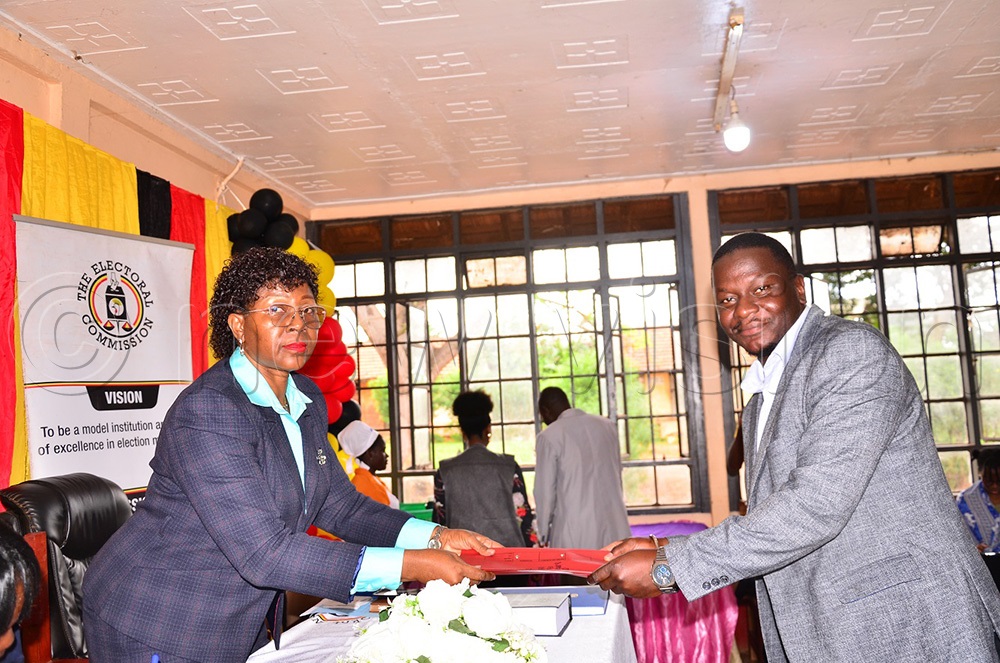 Jinja district returning officer, Sarah Catherine Kabukaire (R) and another official during the nomination exercise at Kagoma town council headquarters in Jinja district. (Photo by Jackie Nambogga)