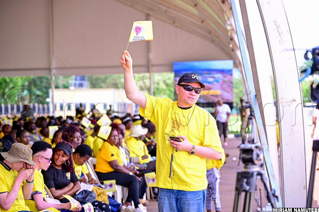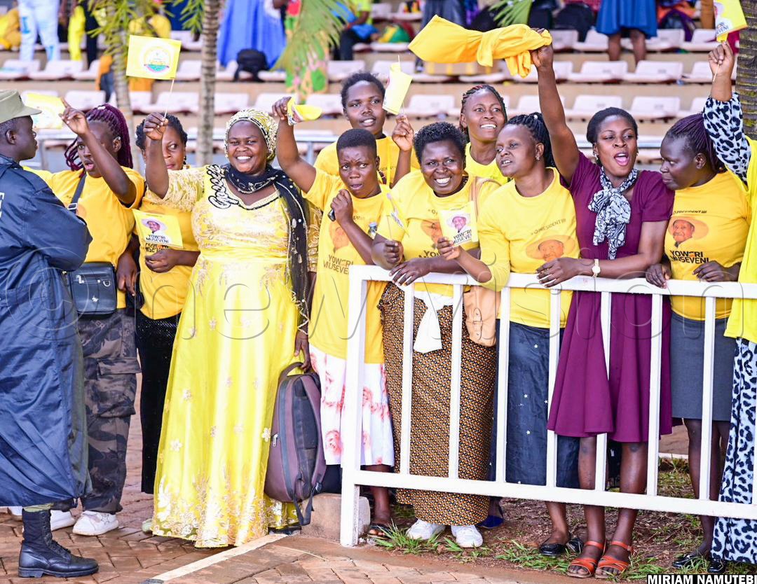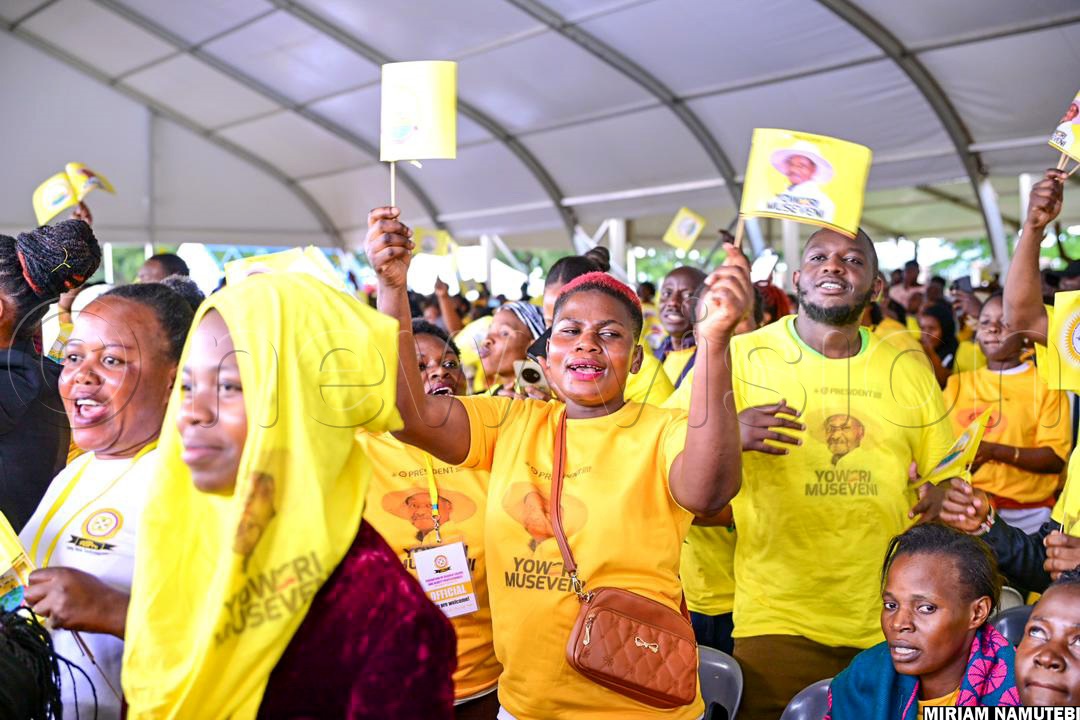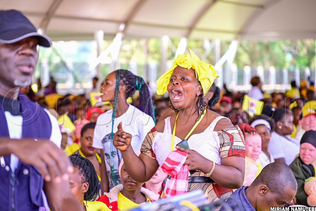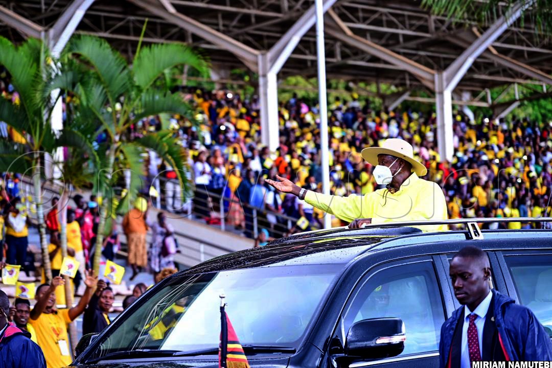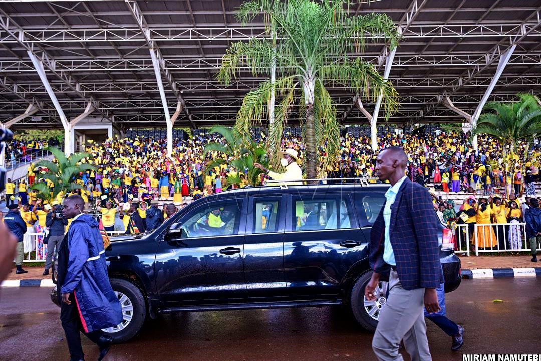 Museveni arrived at about 1:49 pm to the blaring sounds of the ‘Tubonga Nawe’ anthem. From the gate, in what felt like a victory lap, he was cheered on by a sea of yellow-clad supporters all the way to the podium.