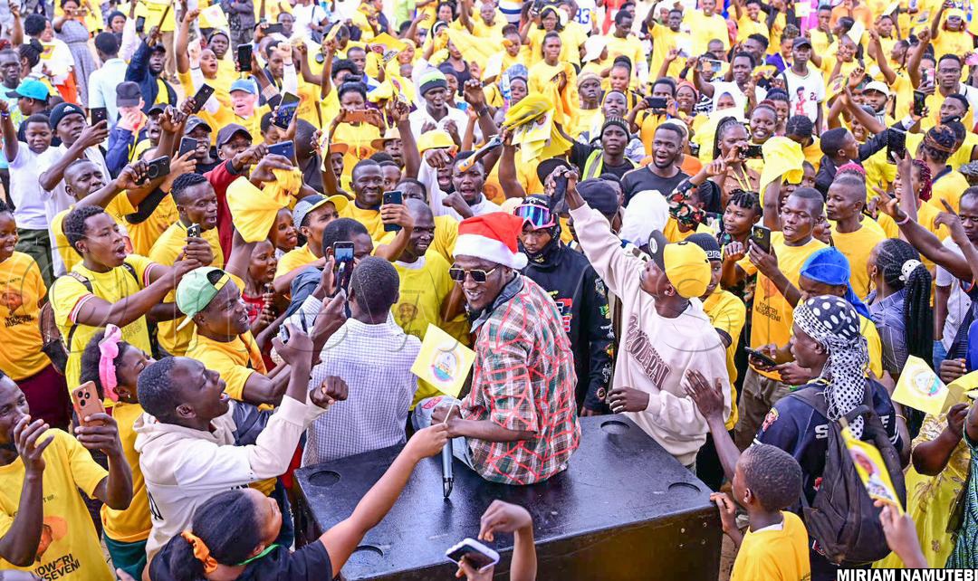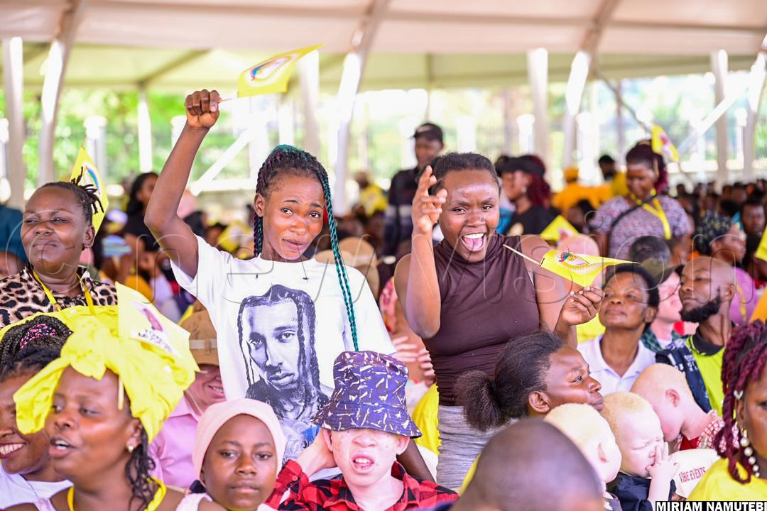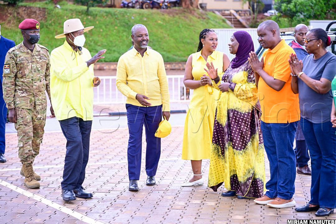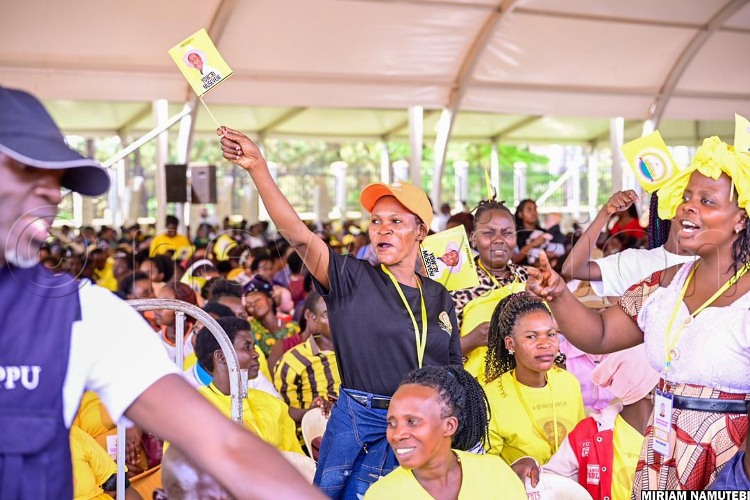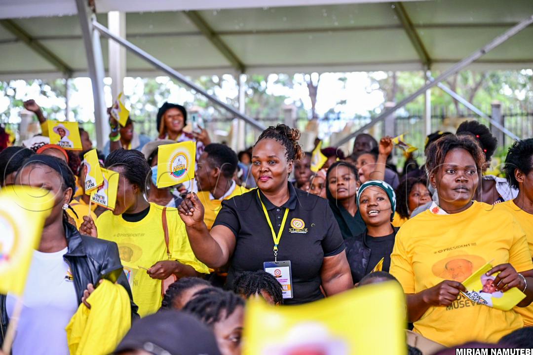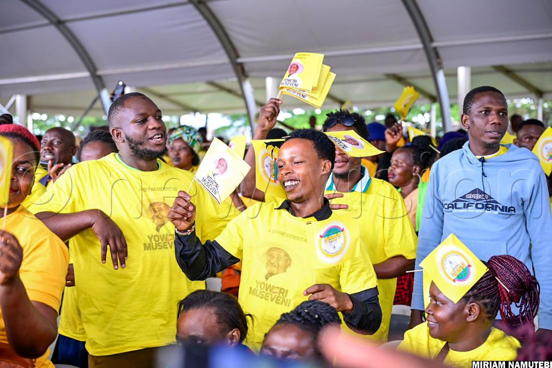 Museveni arrived at about 1:49 pm to the blaring sounds of the ‘Tubonga Nawe’ anthem. From the gate, in what felt like a victory lap, he was cheered on by a sea of yellow-clad supporters all the way to the podium.