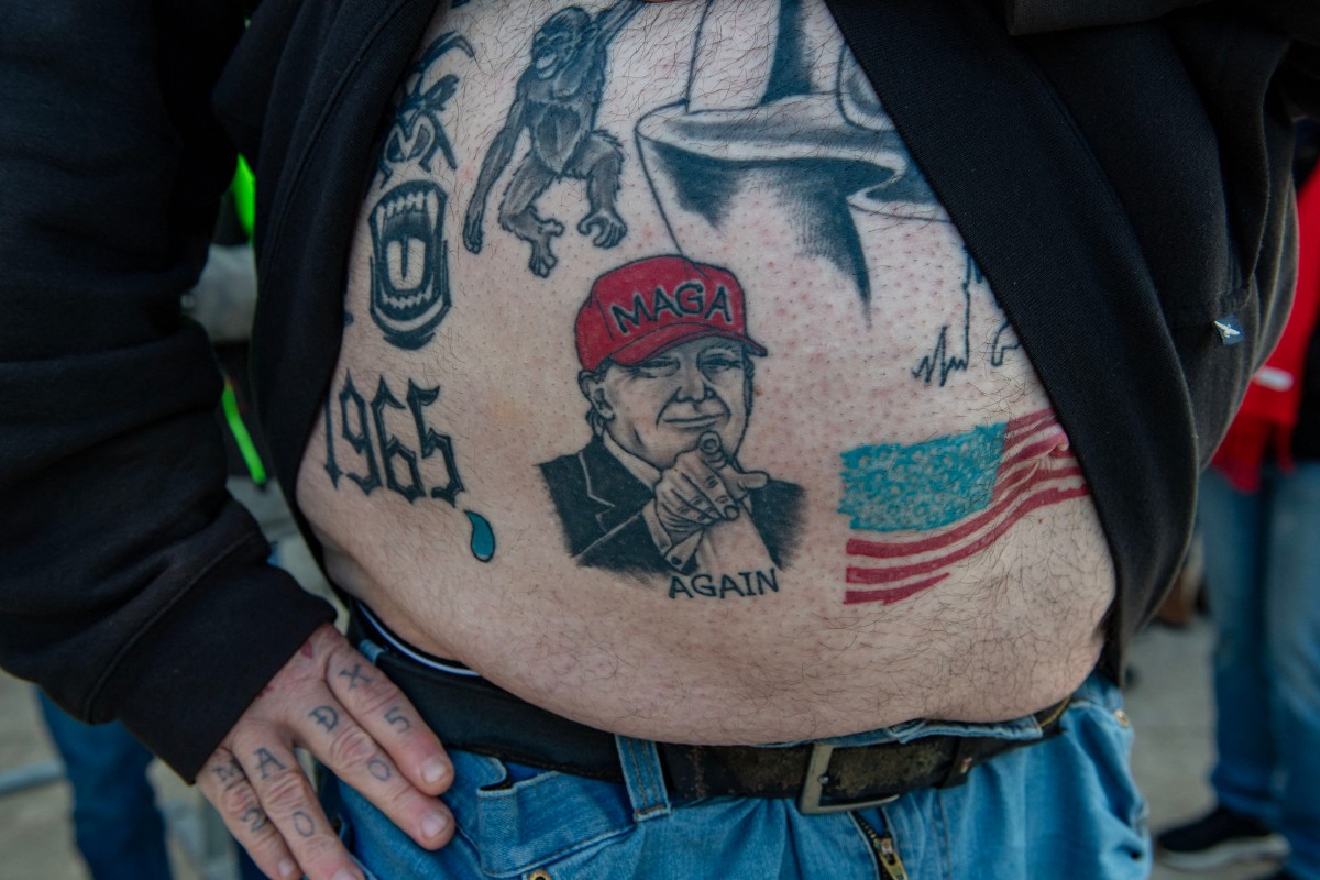A tattooed supporter waits in line to hear former US President and 2024 presidential hopeful Donald Trump speak at a campaign rally at the University of New Hampshire in Durham, New Hampshire. (AFP)
