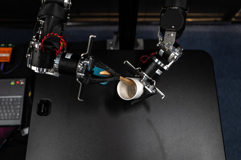 A pair of swivelling, human-like robotic arms, built for physical artificial intelligence research, mirror the motions of an operator in a VR headset twirling his hands like a magician.