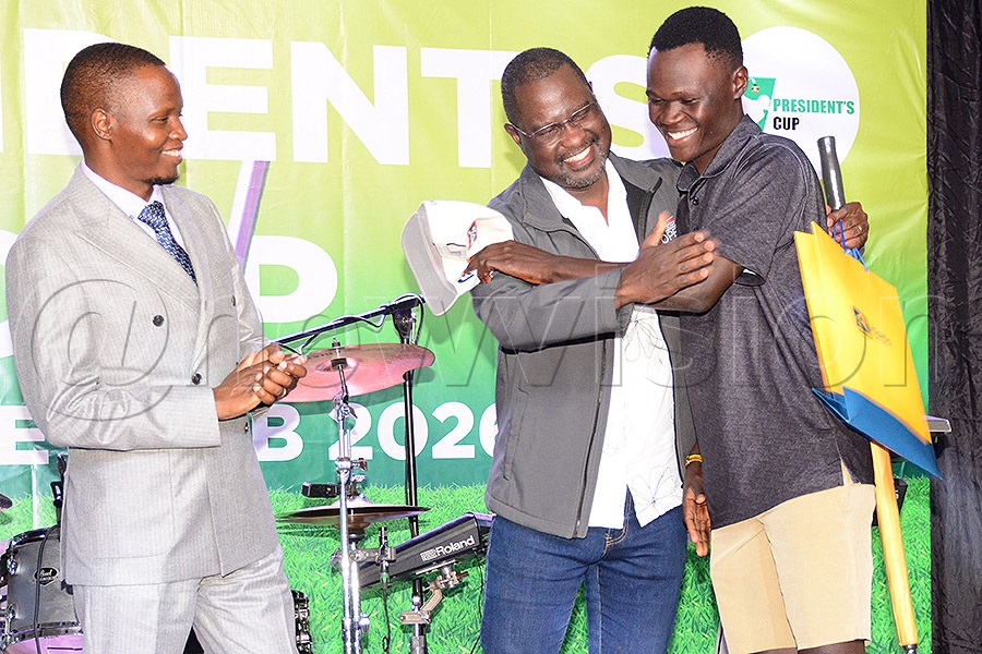 NCS Assistant General Secretary-Techinical Milton Chebet (left) and UGU president Jackson Were (center) reward Joseph Akena after the presidents cup tournament at Entebbe Club, April 25, 2026. Photo by Michael Nsubuga
