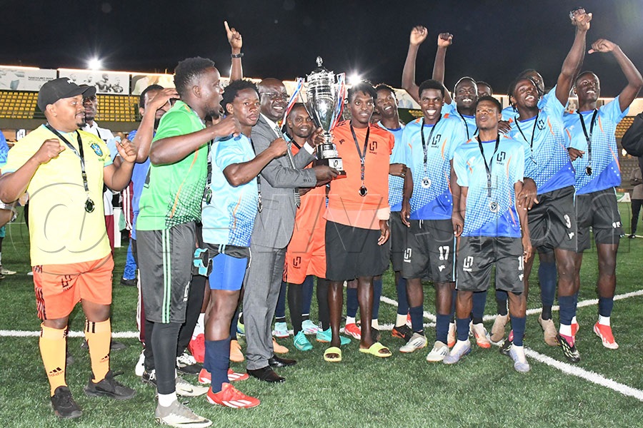 Hamz Nakivubo Stadium Management Committee Chairman Rogers Mulindwa (5th left) hands over the overall winners trophy to Block G team members after the tournament at Nakivubo. Photo by Michael Nsubuga
