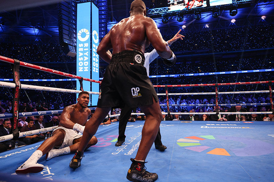 Anthony Joshua is knocked to the ground by Daniel Dubois during their heavyweight boxing match for the IBF world title. AFP PHOTO