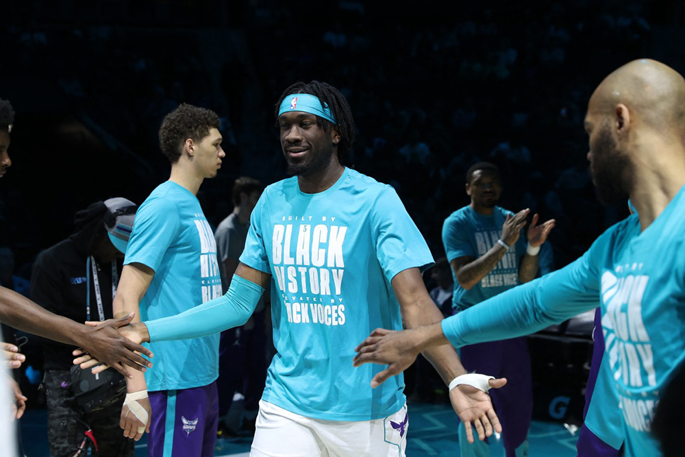 Mark Williams #5 of the Charlotte Hornets is introduced before the game against the Milwaukee Bucks on February 5, 2025, at Spectrum Center in Charlotte, North Carolina. (Getty Images via AFP)