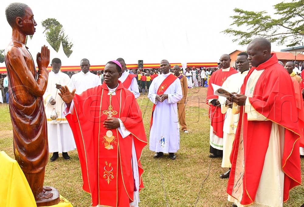 Jinja Catholic diocesan Bishop Charles Wamika blessing a Statue of St. Gonzaga Gonza during celebrations to mark the 60th anniversary of St. Gonzaga Gonza Day at Bugonza in Kaliro district on Sunday. (Credit: Donald Kiirya)