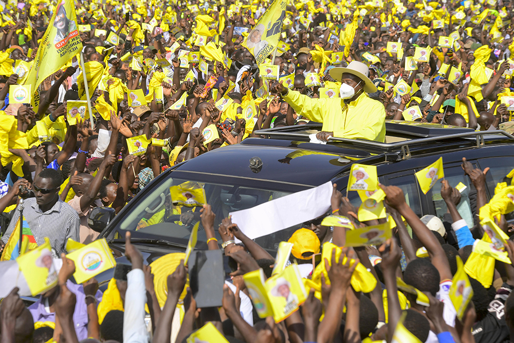 President Museveni arrives for the campaign rally amidst cheers from the NRM supporters. (PPU)