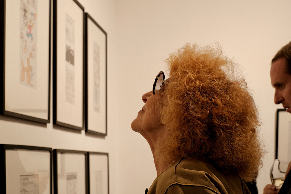 A woman looks at a work hanging on the wall in the Huberty and Breyne Gallery during the opening of the exhibition in tribute to CHARLIE HEBDO cartoonist WOLINSKI, in Paris, France, 12 September 2024. (Credit: AFP)