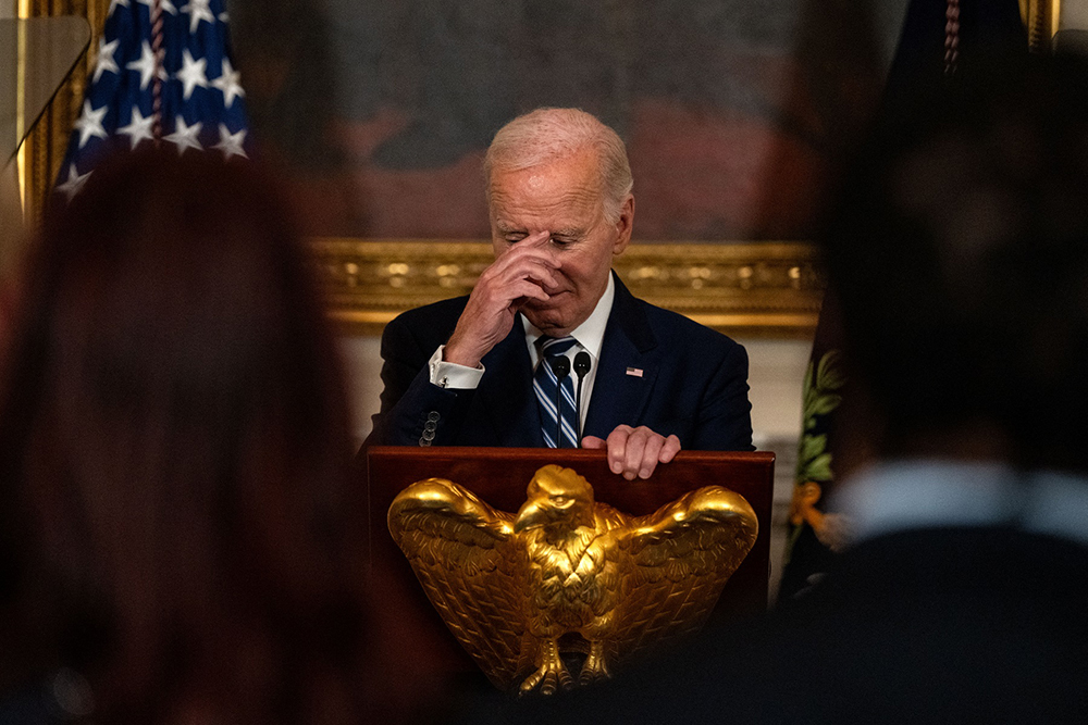 U.S. President Joe Biden gestures, making the sign of the cross, as he speaks during a reception for new democratic members of the United States Congress in the State Dining Room of the White House on January 5, 2025 in Washington, DC. (Credit: AFP)