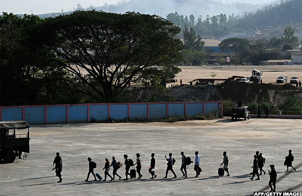 Alleged victims of scam centres in Kyaukhat town in Myanmar’s Kayin State walk in line as they are met by the Thai Army after crossing the Thai-Myanmar border. Fraud compounds where scammers lure internet users into fake romantic relationships and cryptocurrency investments have flourished across Southeast Asia, including in the lawless borderlands of Myanmar. (AFP/Getty Images)