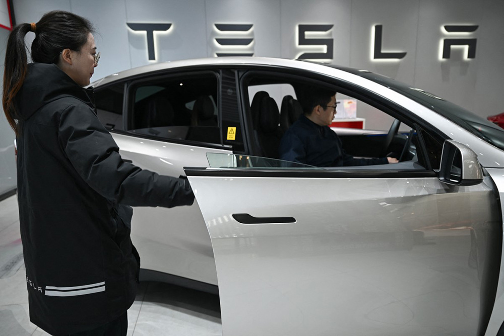 A woman opens the door for a Tesla Model YL electric vehicle as a customer looks inside at a showroom in Beijing on February 3, 2026. China will ban hidden door handles on cars sold in the country from next year, phasing out the minimalist design popularised by Tesla over safety concerns. (Photo by Pedro Pardo / AFP)