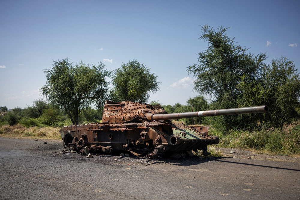 (FILES) The charred remaining of a T-72 tank lay on the road that connects Shiraro to Shire on October 12, 2024. (AFP)