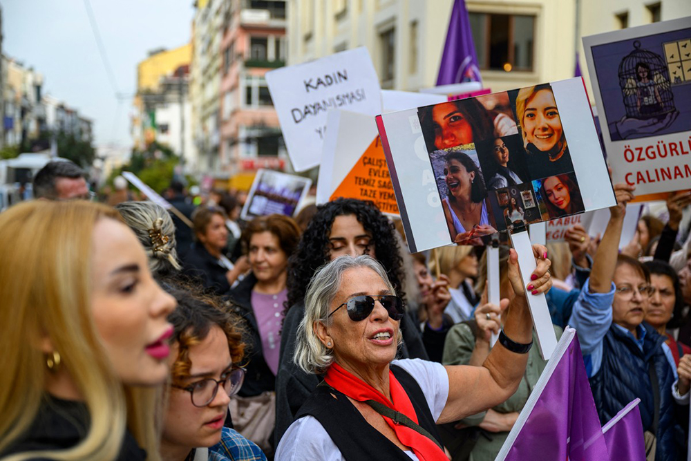 Protesters hold placards and shout slogans during a protest ahead of the International Day for the Elimination of Violence Against Women, in Istanbul, on November 23, 2025. (AFP)